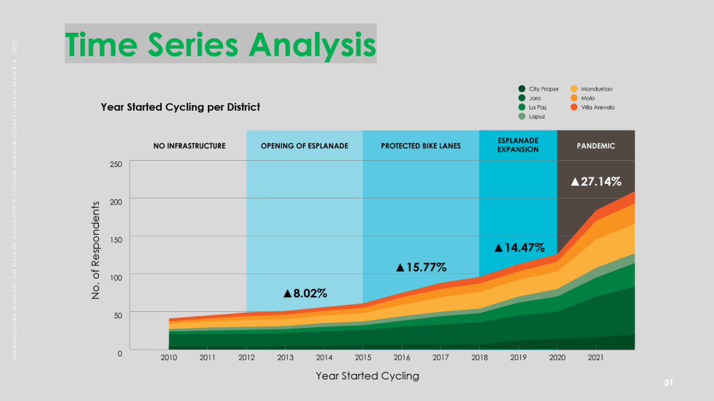 In my independent study, I found that there is a direct link on how infrastructure for cycling has influenced the increase of cyclists in Iloilo City. Through historical data review and stakeholder surveys, I structured how the cycling culture developed in Iloilo City. These were then subjected to several analyses by introducing cycling infrastructure expenditure and GIS data to verify how the infrastructure component has influenced bike use over time and its potentials.
